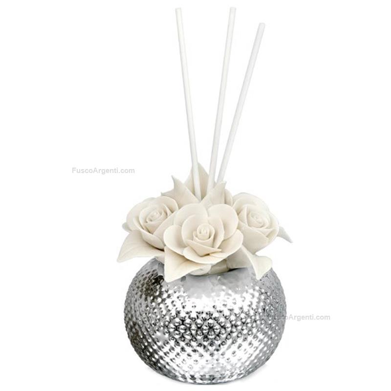 Profumatore in porcellana argentata con fiori bianchi. Bomboniere profumatori cm 8x8 Marca: Atelier . Cod. prodotto: ae5569/155