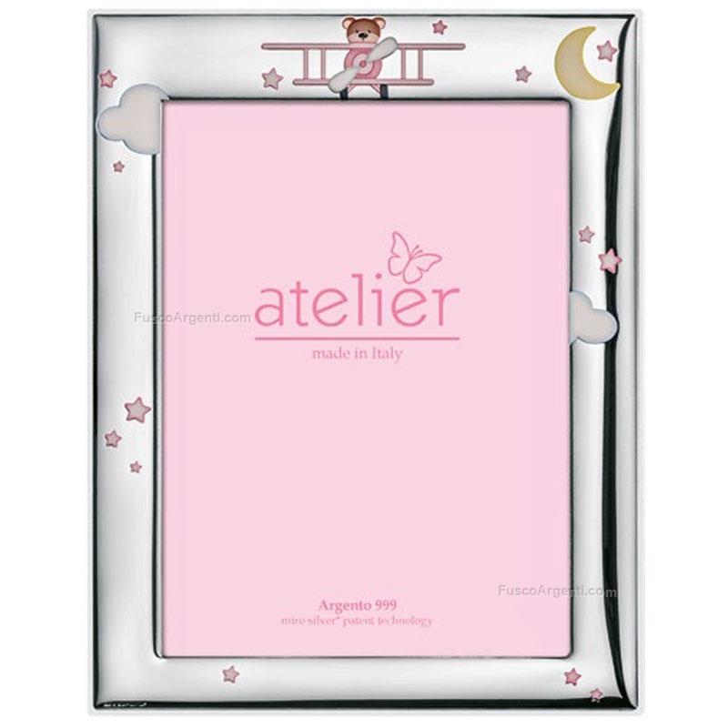 Portafoto bimbo in argento laminato "orsetto biplano", retro legno. Bimbo cornici prima infanzia cm 10x15 - rosa Marca: Atelier . Cod. prodotto: co3878/3xra