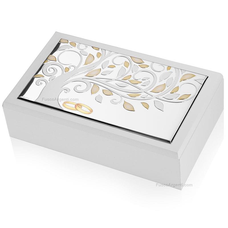Porta gioie in legno bianco e argento laminato "albero della vita" matrimonio. Ricorrenze cofanetti anniversario e matrimonio cm 16,5x10,5 h 5,5 - fedi