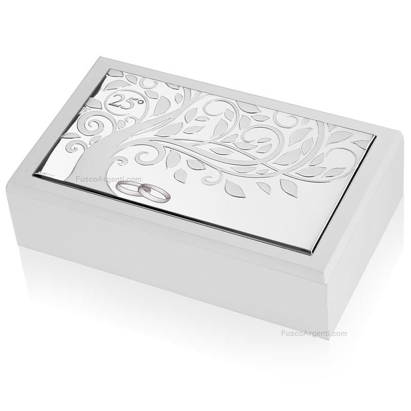 Porta gioie in legno bianco e argento laminato "albero della vita" anniversario. Ricorrenze cofanetti anniversario e matrimonio cm 16,5x10,5 h 5,5 - 25°
